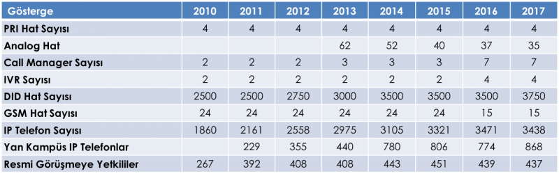 Üniversitemiz sesli iletişim altyapısında 4 adet PRI hat arkasında Cisco ve Asterix Santral sistemine bağlı dahili/dış hat olarak 3750 adet DID numara çalışmaktadır.